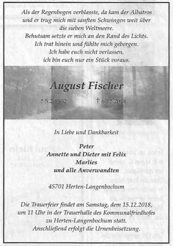 Uns hat die traurige Nachricht erreicht, dass unser Ehrenmitglied August Fischer, im Alter von 86 Jahren am 6. Dezember 2018, verstorben ist.